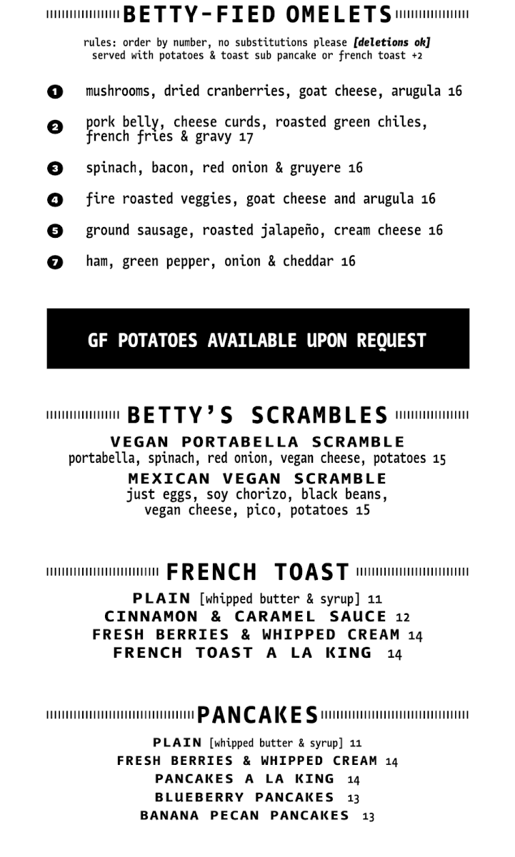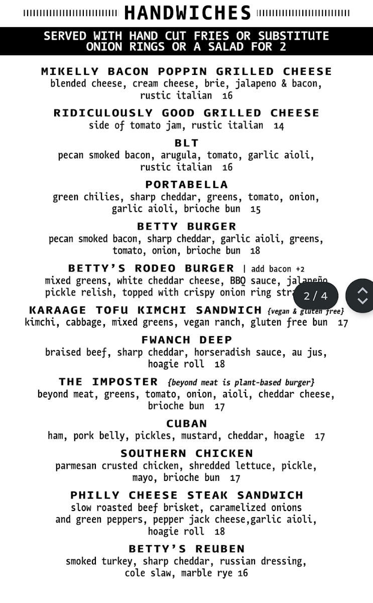 One of the highlights of dining at One-Eyed Betty's is their extensive menu, particularly their enticing lunch offerings. If you're in the mood for comfort food reimagined, you can't go wrong with the Bettyfied Omelette No. 1, praised by locals for its unique twist featuring cranberries, offering a delightful balance of savory and sweet. Customers rave about the fried fish sandwich, boasting a generous portion of crispy, golden-brown fish that's tender at the core, making it a true standout. For those craving a classic, the imposter burger has received glowing reviews for being both juicy and satisfying, with a perfect complement of fresh toppings that make every bite memorable.